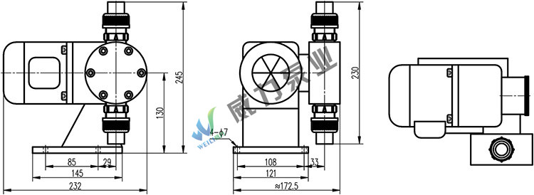 | 型号 | 流量(1/h) | 压力(Mpa) | 行程(mm) | 冲次(min-1) | 隔膜直径(mm) | 电机功率(W) | 进出口径(DN) |